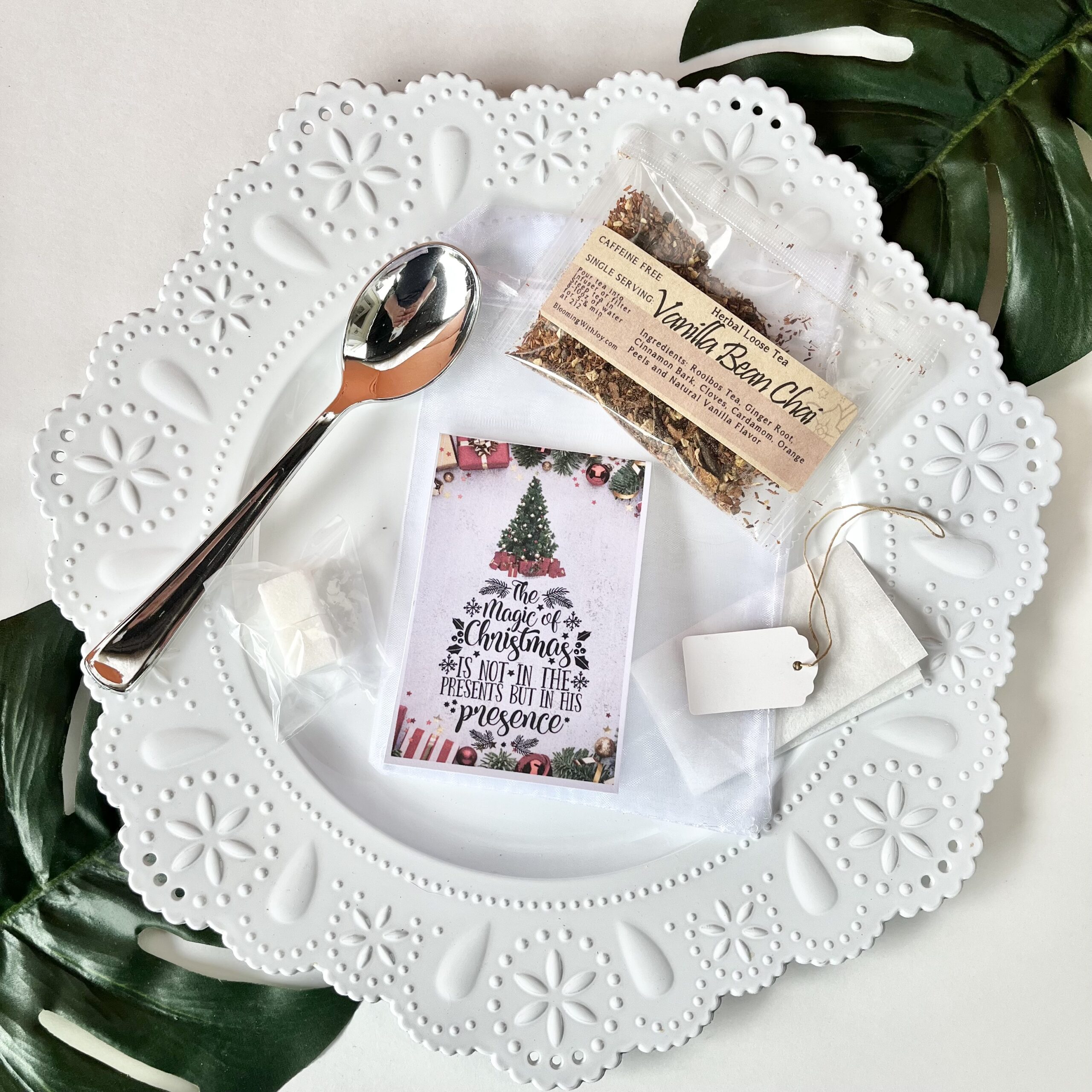 The true magic of Christmas isnโt in the presentsโitโs in His Presence. This delightful tea party favor is the perfect way to share warmth, love, and a little festive cheer! Whether youโre gifting a friend, hosting a holiday gathering, or tucking it into a stocking, this little bundle is a hug in a bag!